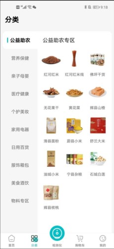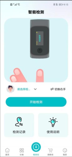 进入后,内容主要分为首页、产品分类、智能检测仪、购物车和个人主页这几个板块。