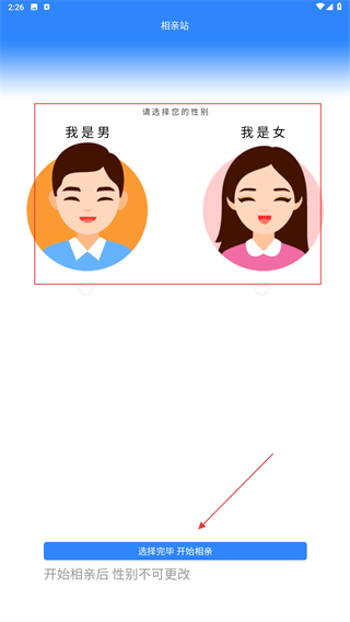 2、在性别选择页,选择【我是男】或【我是女】的性别选项后,点击【选择完毕开始相亲】按钮,进入相亲环节(性别选定后不可更改)。