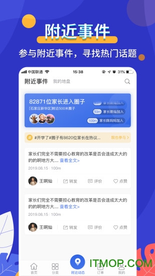 用户可以借助地理定位功能,发布自己在教育领域的相关资讯与问题;这些由用户发布的内容,会被推送至附近区域的动态板块;一旦用户的动态或问题发布成功,其他用户便能对其进行详情查看、转发、回复、评价以及点赞等操作。