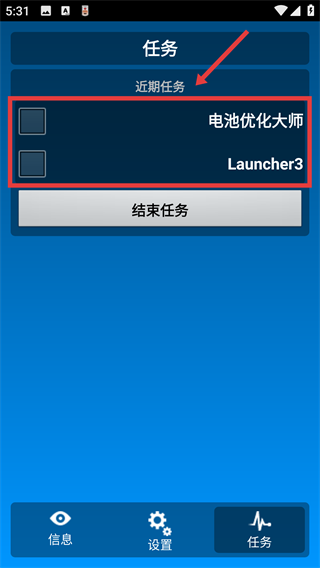 3、在任务界面的“近期任务”列表里,勾选想要结束的目标任务(例如“电池优化大师”)。