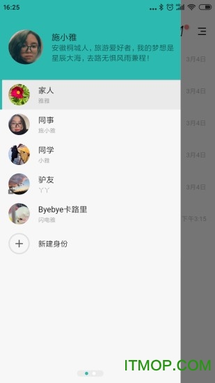 可以在线创建个人身份,无论是家人、同事、同学还是驴友等身份都能设置,以便和不同的人进行线上交流。