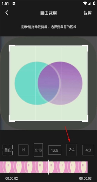 2、进入自由裁剪界面,按照提示拖动裁剪框,选定需要保留的视频区域,也可以选择底部的比例选项来调整画面。