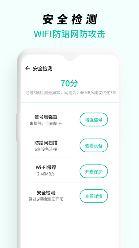 软件提供多种实用功能,帮助用户优化网络连接体验。强力探索WiFi热点功能可以快速扫描周围可用的网络,用户无需手动查找,节省时间和精力。测速功能能够实时监测当前连接网络的速度,用户可随时了解网络性能,及时做出调整。安检功能确保用户的网络安全,帮助识别不安全的网络,避免潜在的安全隐患。流量监控功能则提供详细的流量使用报告,清晰了解自己的流量消耗情况,从而合理安排上网行为。内存清理功能可以有效提升手机的运行速度,避免因内存不足而导致的卡顿问题,确保用户在使用过程中流畅无阻。