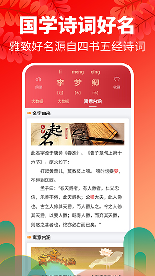 不仅如此,这里还传承着《周易》的人文思想,拥有数量多达百万的优质名字。每一个名字都经过精心考究,既注重发音的韵律美感,又追求涵义的丰富深远,力求让名字既优雅别致又富有内涵,达到过耳难忘、印象深刻的效果;尤为重要的是,这些名字还贴合个人的生辰八字,契合自身的八字命理!