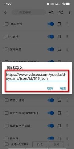 然后把下面的地址复制一个书源粘贴进去,点击“确定”,稍作等待后,就会显示出待导入的书源。