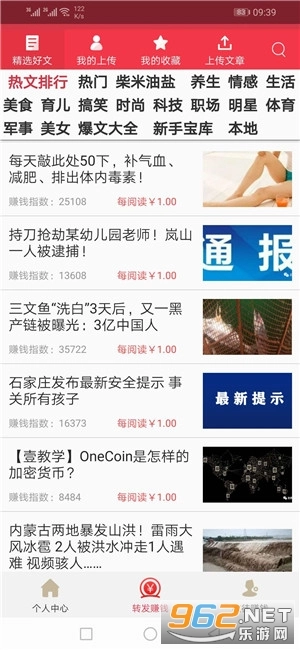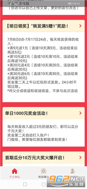 新用户注册即送1元奖励,转发文章的单价全天保持1元/篇;转发收益累计满5元额外赠送1元,满10元额外赠送2元,平台同时支持用户自主上传文章。