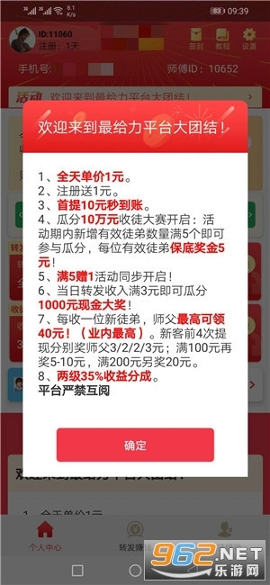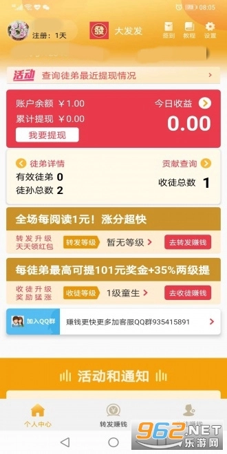 新用户注册大发发平台可获得1元奖励,转发内容的阅读单价不低于1元,平台每天会在三小时内不定时提高转发单价。