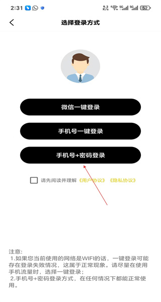 3、进入选择登录方式页面,浏览多种登录选项,点击手机号+密码登录,进入用户登录页面。