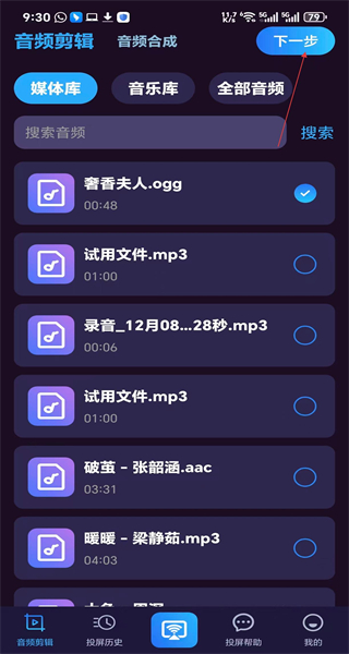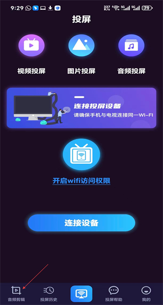 1、打开软件后,进入首页,看到视频投屏等功能,点击音频剪辑选项,进入音频选择页面。