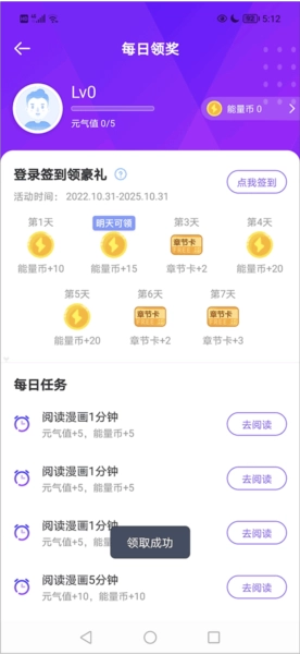 在个人中心页面,用户能够通过完成任务来积累元气值与能量币,进而兑换更多福利。