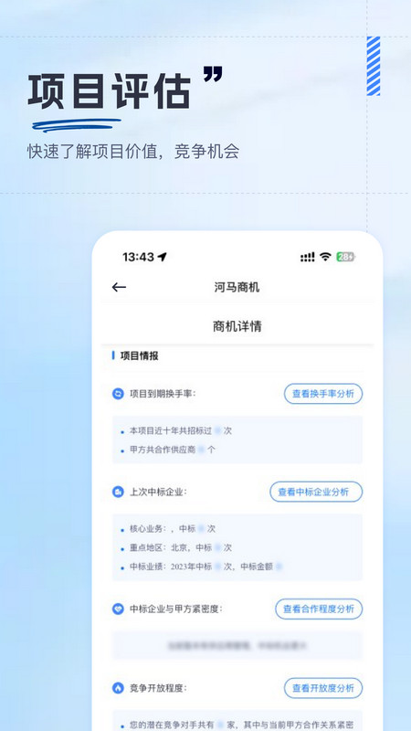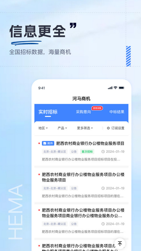 河马商机是一款专为商务人士打造的商业信息平台,它提供了丰富的招标采购信息,帮助用户及时发现商机。在河马商机里你会发现有很多非常全面的信息,方便大家提前跟进,还可以进行项目和评估。功能强大,商人必备。