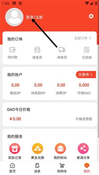 2、进入“我的”页面,点击“登录/注册”选项,进入账号登录相关界面。