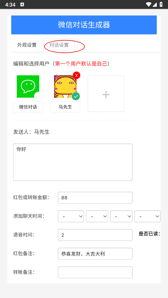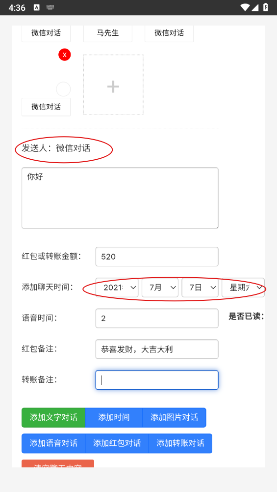 4、下滑操作还能用于添加对话人、输入对话文字、设置时间、发送红包等功能。