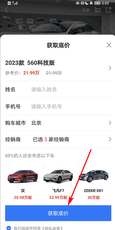 可能需要填写个人信息,如姓名、联系方式等;5.填写完毕后提交,即可查看到该车型的底价。