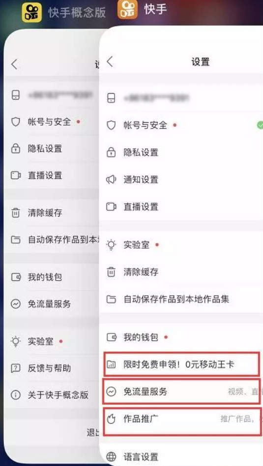 此外,概念版功能更简洁,免去快手上关于移动王卡、免流量服务等商务合作项目,表明概念版剥离快手商业化任务,更纯粹地投入到产品探索上。