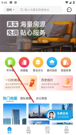 1、在首页的功能栏中点击【写字楼】选项,即可进入写字楼房源列表页面,在此页面能够查看所展示的各类写字楼房源信息。