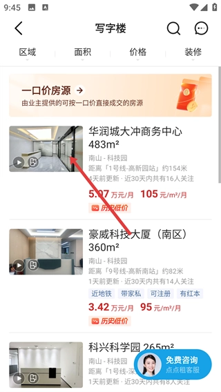 2、在写字楼房源列表里,挑选像【华润城大冲商务中心】这类目标房源,查看它们的面积、租金以及区位等相关信息。