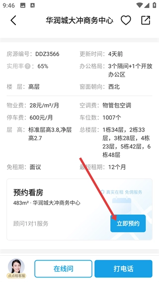 3、进入房源详情页面,查看实用率、物业费等各项参数后,点击页面上的【立即预约】按钮,即可进入看房预约的具体流程。