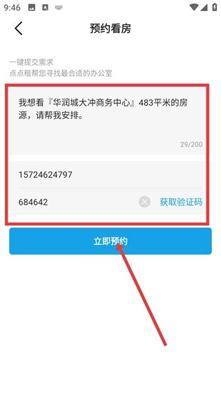 4、进入预约看房页面后,填写房源需求和手机号码,获取【验证码】,确认信息无误后点击【立即预约】按钮提交看房申请。