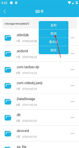 3、在弹出的功能菜单中选择移动选项,准备将该文件夹转移至其他存储位置。