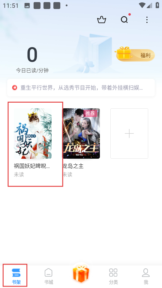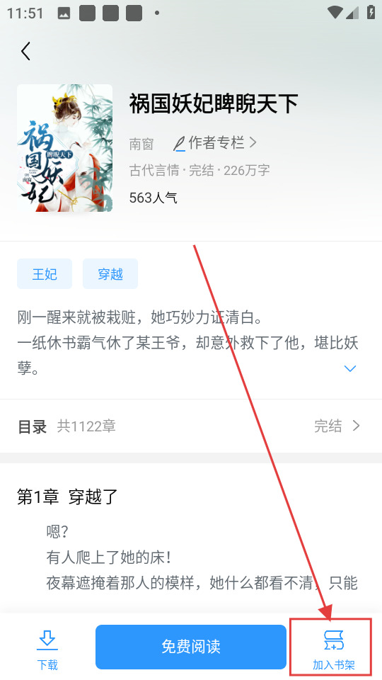 点击【书架】,就能看到添加的《祸国妖妃睥睨天下》,快速进入阅读啦。