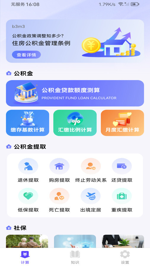 1. 软件安装完成后打开,在首页能够看到缴存基数计算等各类功能。