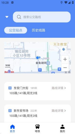 3、精准定位用户周边的公交站点,清晰展示各站点距离以及途经的线路,帮助用户迅速了解附近公交出行的可选方案。