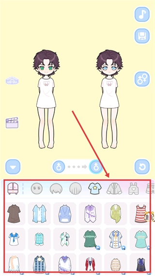 3、切换到底部的上衣装扮栏,选择心仪的服饰(如条纹上衣),点击后可直接为角色更换上衣造型。