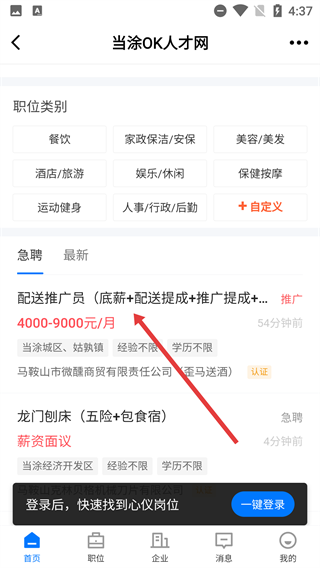 4、在当涂OK人才网页面,可查看各类职位信息(如配送推广员、龙门刨床等岗位),了解岗位薪资、工作地点等详情。