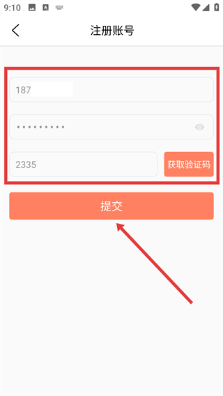 4、注册账号的步骤为:先填写手机号,接着设置密码,然后获取并填写验证码,最后点击“提交”按钮,即可完成注册流程。