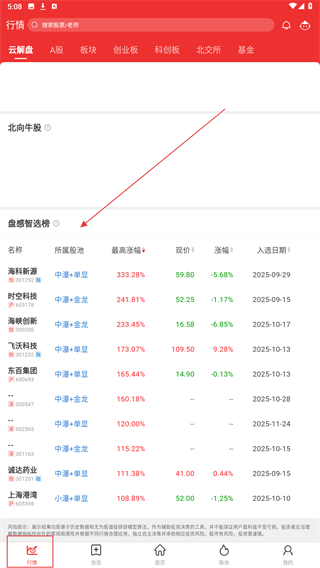 4、切换至【行情】页面,能够查看“盘感智选榜”等股票相关信息,获取个股的涨幅、现价等数据作为参考。