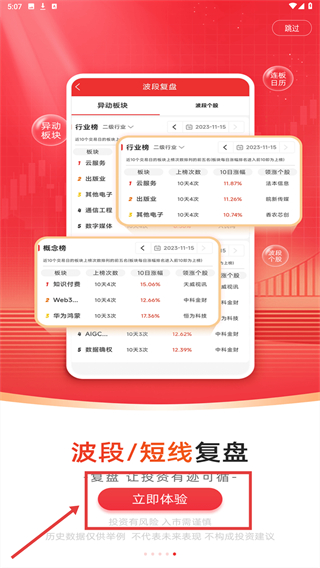 在应用引导页点击【立即体验】按钮,即可进入投资复盘类应用,使用波段/短线复盘功能。