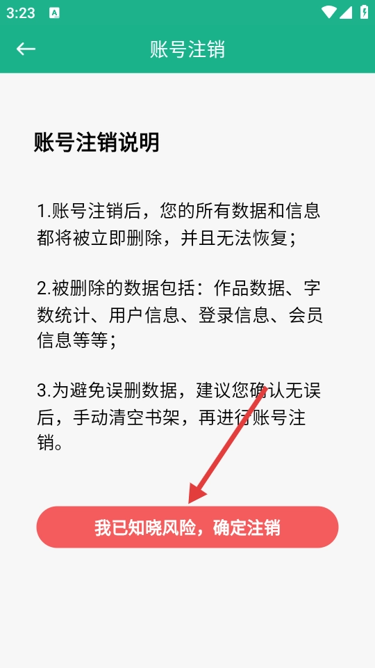 4、在账号注销说明页面点击【我已知晓风险,确定注销】按钮,即可完成账号注销操作。