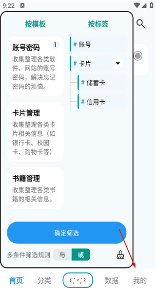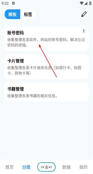 4、完成登录后回到分类页面,看到账号密码等模板选项,可选择对应模板进行信息管理。