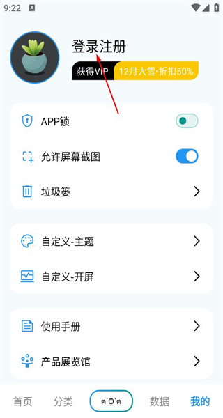 2、进入个人中心页面,看到登录注册提示及锁等设置选项,点击登录注册,进入登录页面。