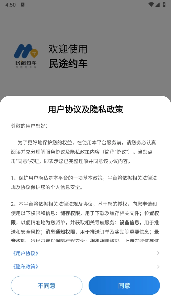 1、首先在本平台完成民途约车的安装操作,并仔细阅读相关的用户协议与隐私政策。