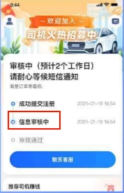 提交材料后,预计2个工作日内可查询审核结果,审核通过将收到短信通知,登录司机端即可出车接单啦!