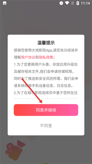 1、阅读【大地影院App】的温馨提示,了解用户协议、隐私政策及权限申请说明后,点击弹窗中的【同意并继续】按钮。
