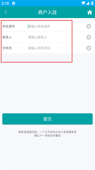 2、进入商户入驻页面后,请按顺序填写各项必填信息:先输入“所在城市”“联系人”“手机号码”,以此完成基础合作信息的录入。