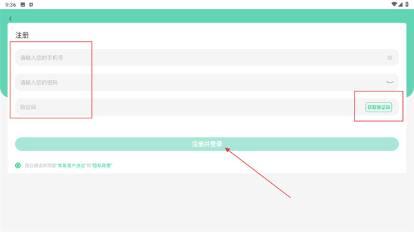 2、进入【注册】页面,依次填写手机号、密码,点击【获取验证码】按钮并输入收到的验证码,勾选相关协议后,点击【注册并登录】按钮,即可完成账号的注册与登录操作。