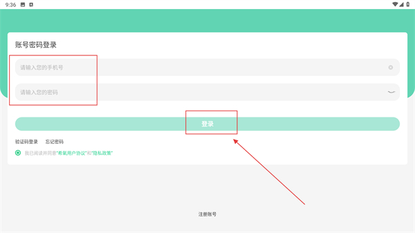 1、进入【账号密码登录】页面,按顺序填写手机号与密码,勾选相关协议后点击【登录】按钮,即可完成账号登录流程。