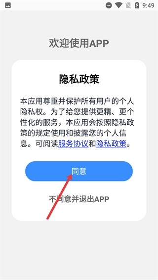 在应用启动后弹出的【隐私政策】窗口中,仔细阅读其中关于个人信息使用的相关说明,然后点击【同意】按钮,就能继续使用该应用提供的服务。