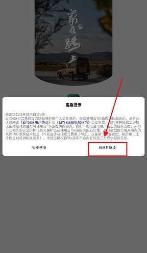 1、打开自驾e族,点击“同意并继续”。