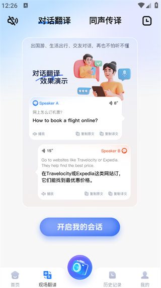 4. 轻点页面下方的“现场翻译”,就能启用对话翻译与同声传译功能。