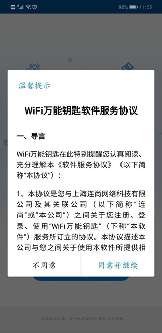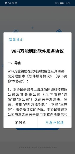 WiFi万能钥匙软件的服务协议,通常直接选择默认选项就可以了,就像下面图片展示的这样: