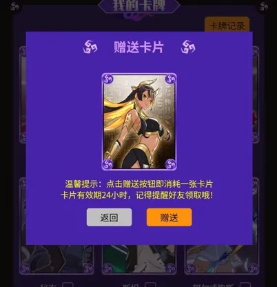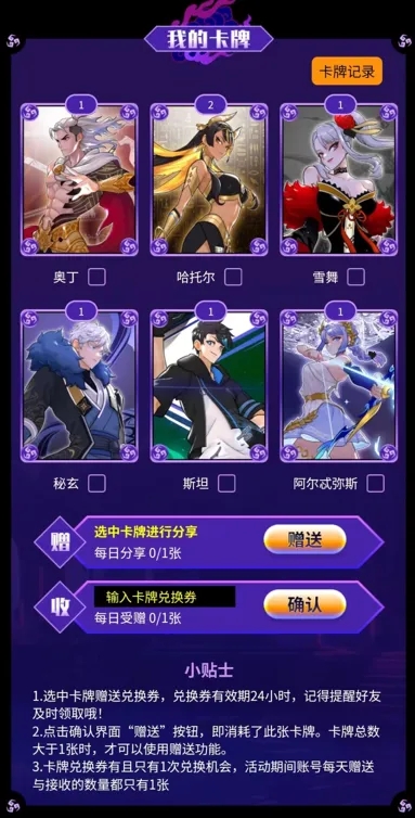 选择卡牌后点击赠送按钮,系统会生成兑换券,你可以将其分享给好友(卡牌记录里能查询历史操作,兑换券的有效时长为24小时) 4. 把兑换券复制到受赠框对应的区域内,就能完成接收操作。