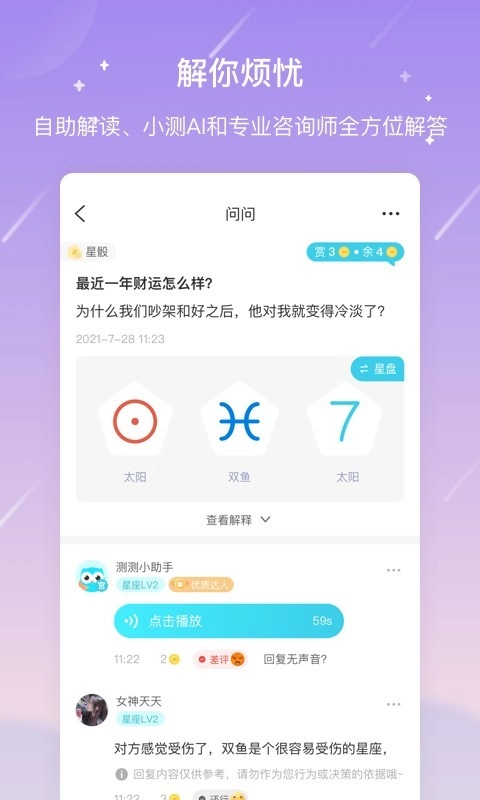 测测星座里还配备了占星骰子这类占卜功能,你可以匿名提问,畅所欲言问任何想了解的问题。之后会有专业的占星达人为你一对一亲自解答,为你带来与众不同的启发与指引。