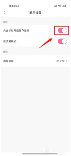 3、进入通用设置界面,找到【允许移动网络缓存漫画】选项,点击其右侧的开关按钮将其开启。