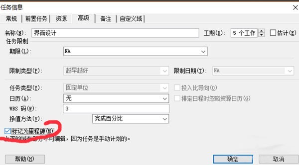 4、接着把任务信息窗口里的选项卡切换到高级选项,勾选【标记为里程碑】这个选项。