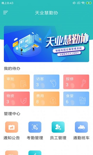 天业慧勤协是一款超实用的校园服务管理软件,功能十分强大,能轻松管理食堂、物资、报修等事项;管理中心还涵盖员工管理、考勤管理与通勤班车管理等模块,操作便捷又省心,感兴趣的话欢迎体验使用!